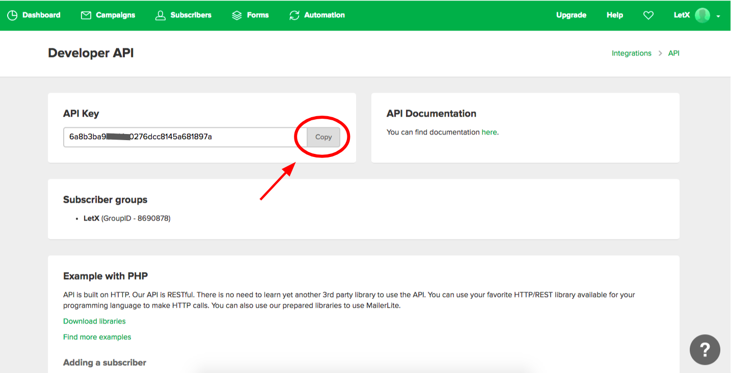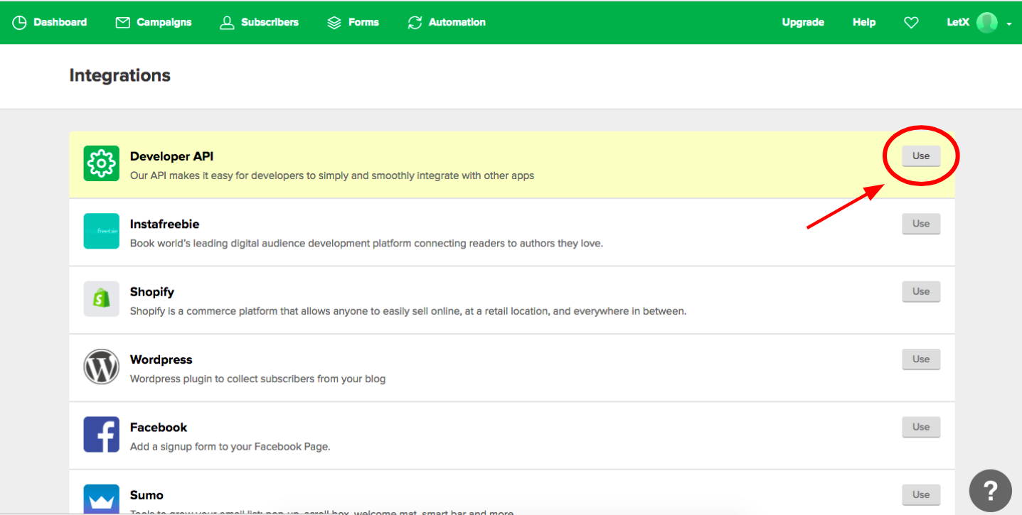 In order to Sync Leads with MailerLite, follow the steps listed below- STEP 1: Login to your MailerLite account, go to the Navigation Bar, click on Integrations. STEP 2: Then in “Developer API” section click on “Use”. STEP 3: Click on “Copy” ...