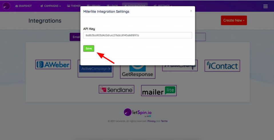 STEP 3: Click on “Copy” under API KEY, then come to your LetSpin.io Dashboard and go to integrations.