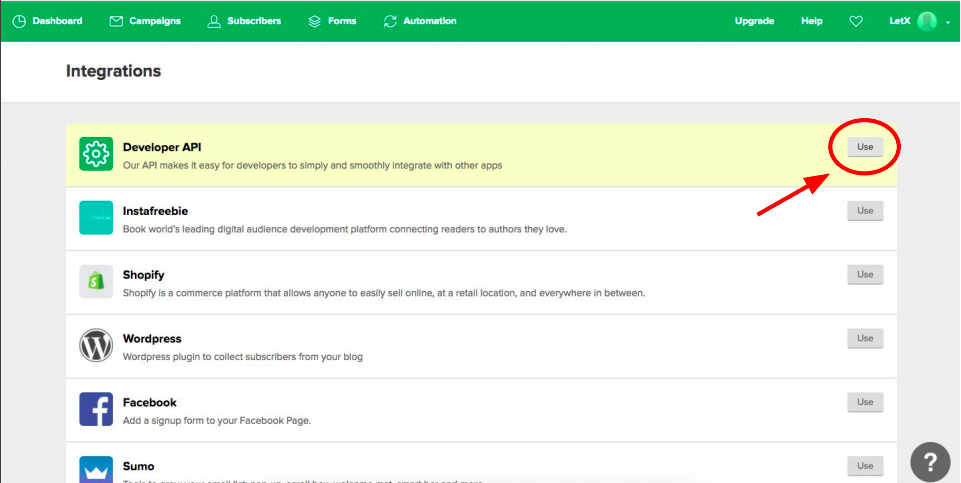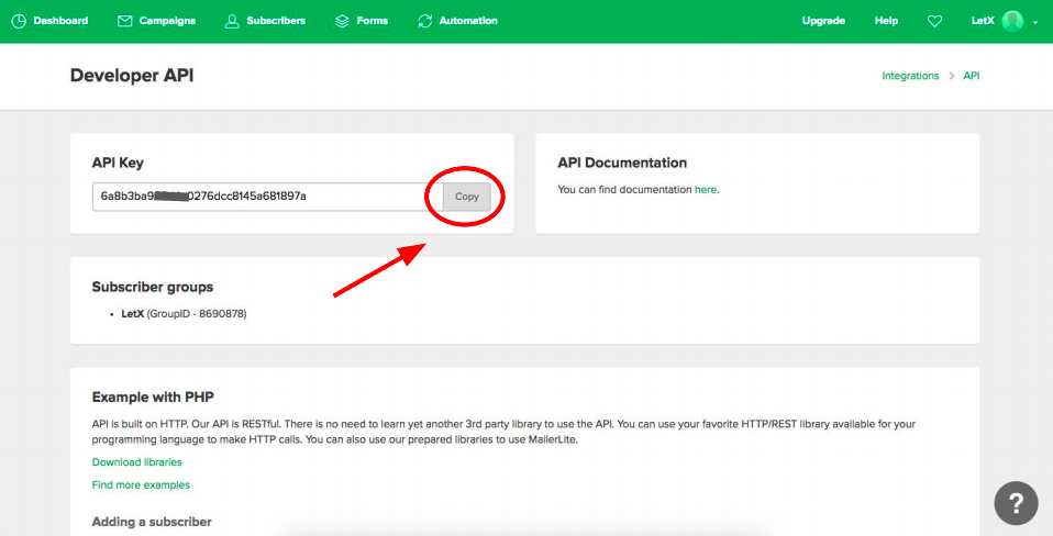 In order to Sync Leads with MailerLite, follow the steps listed below: STEP 1: Login to your MailerLite account, go to the Navigation Bar, click on Integrations. STEP 2: Then in “Developer API” section click on “Use”. STEP 3: Click on “Copy” ...