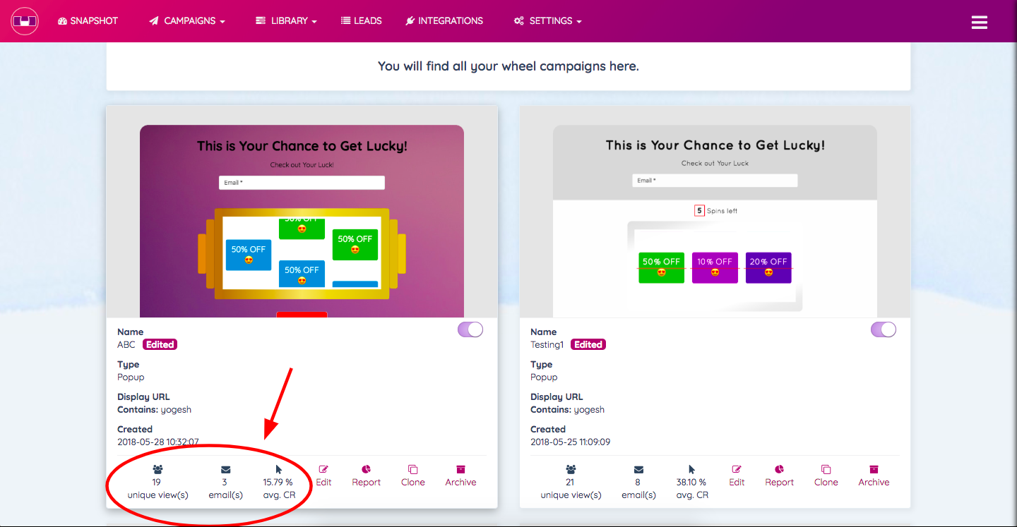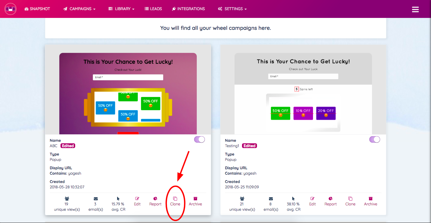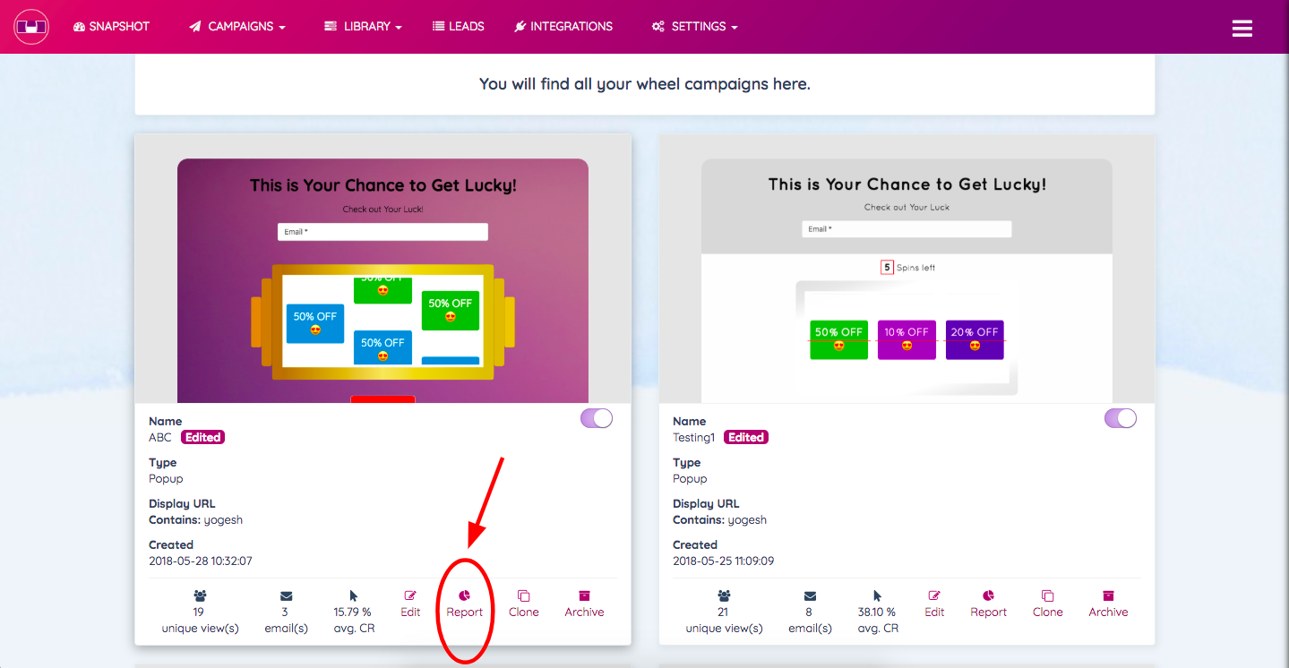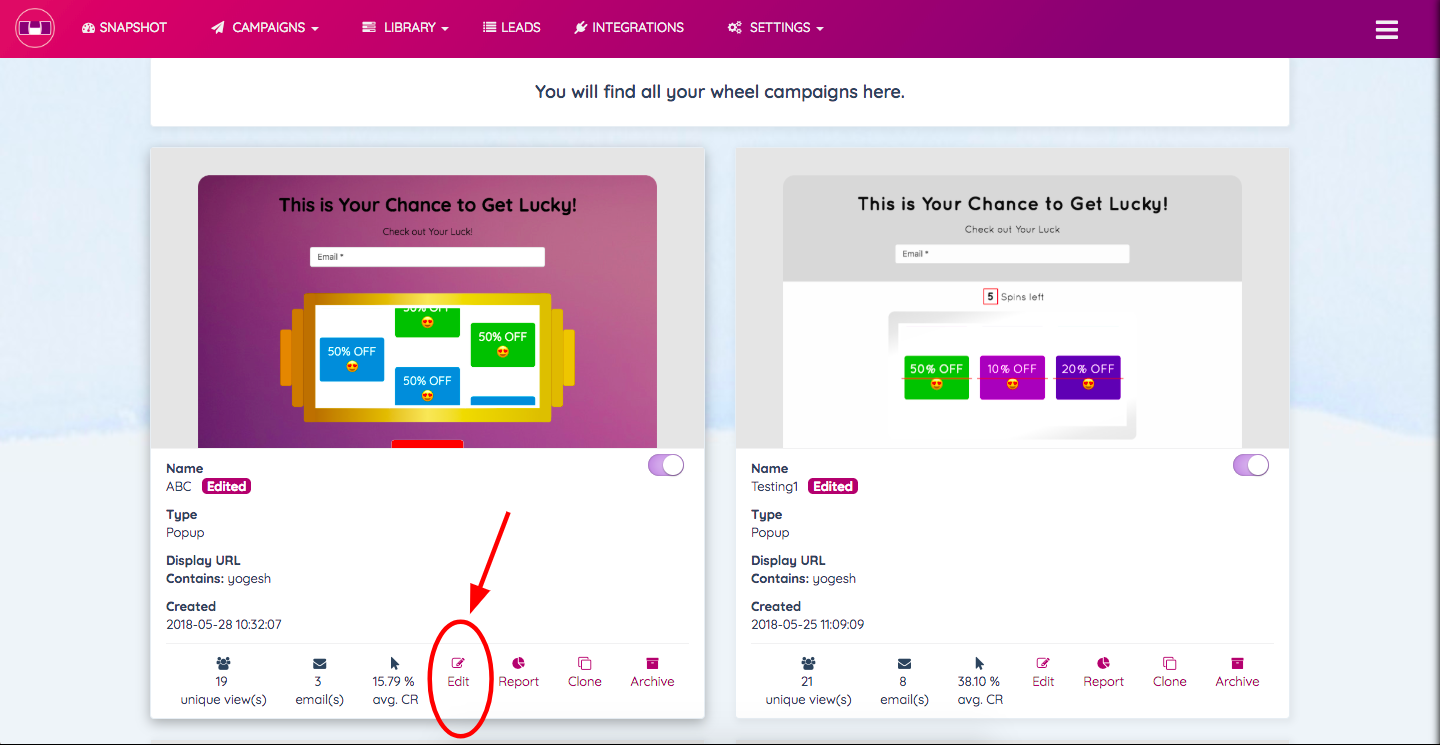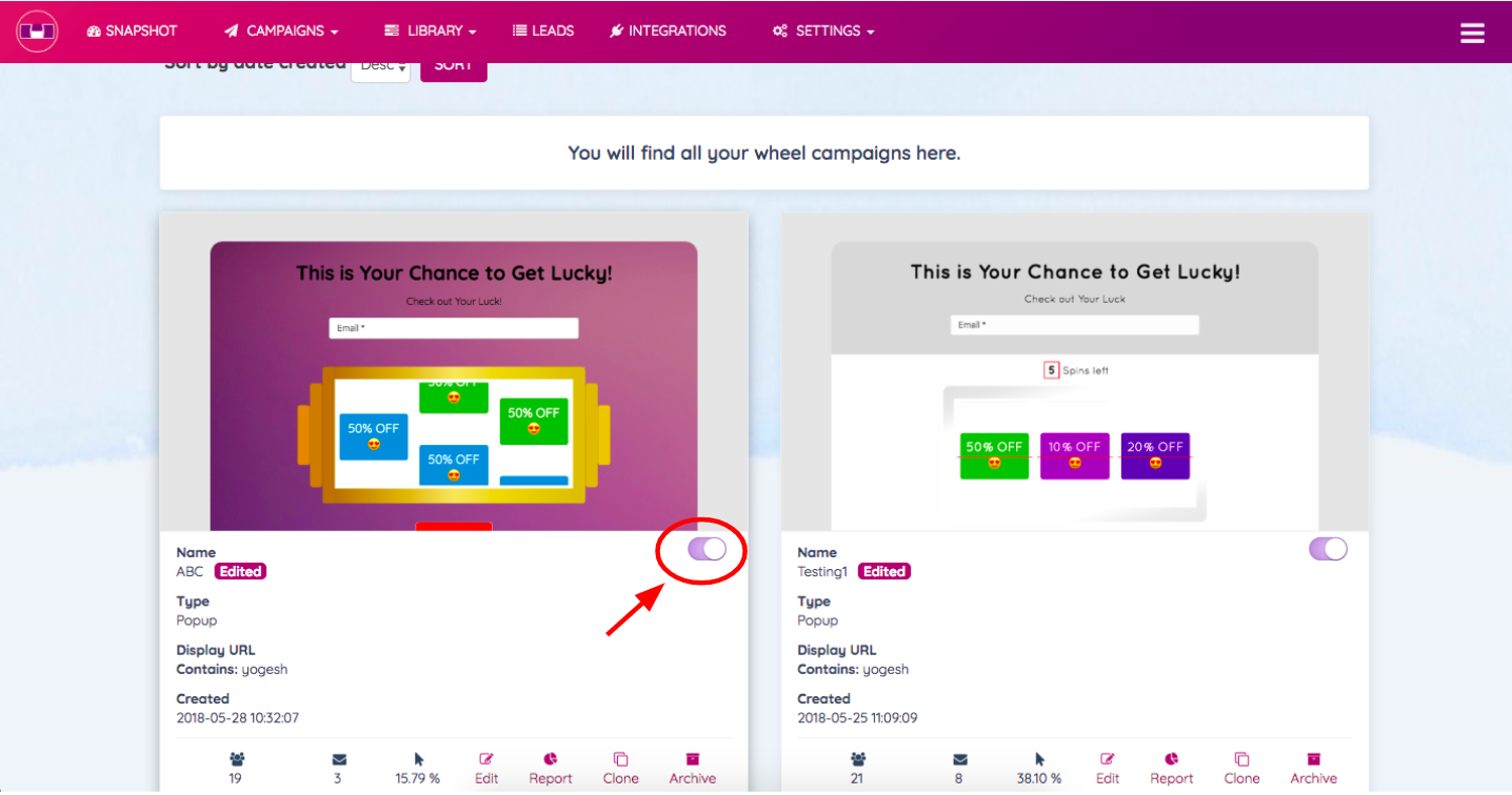 This guide will give you a quick tour of managing your own campaigns. To do so, please follow the steps below : STEP 1: In your LetSpin.io Dashboard, go to “Campaigns”, select “Wheel Campaigns” to be able to see all your campaigns. STEP 2: Under each ...