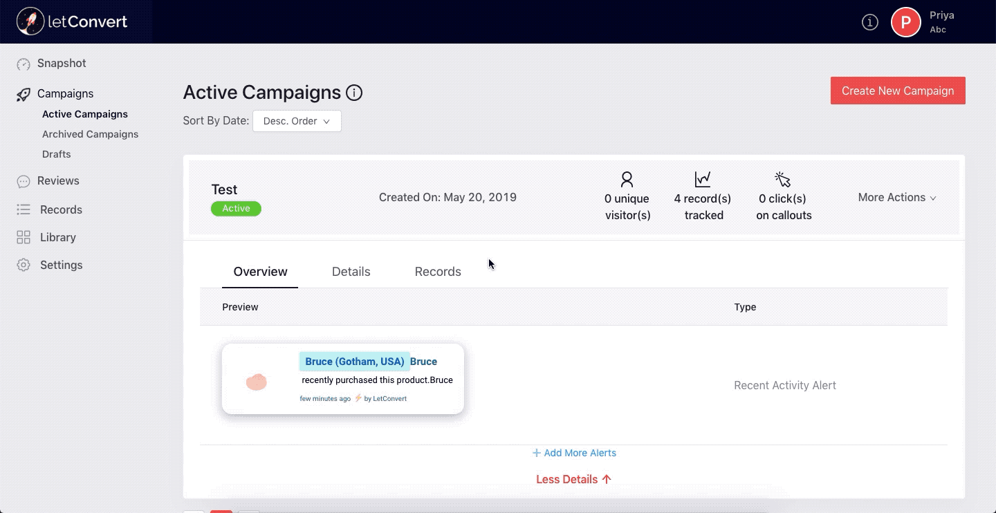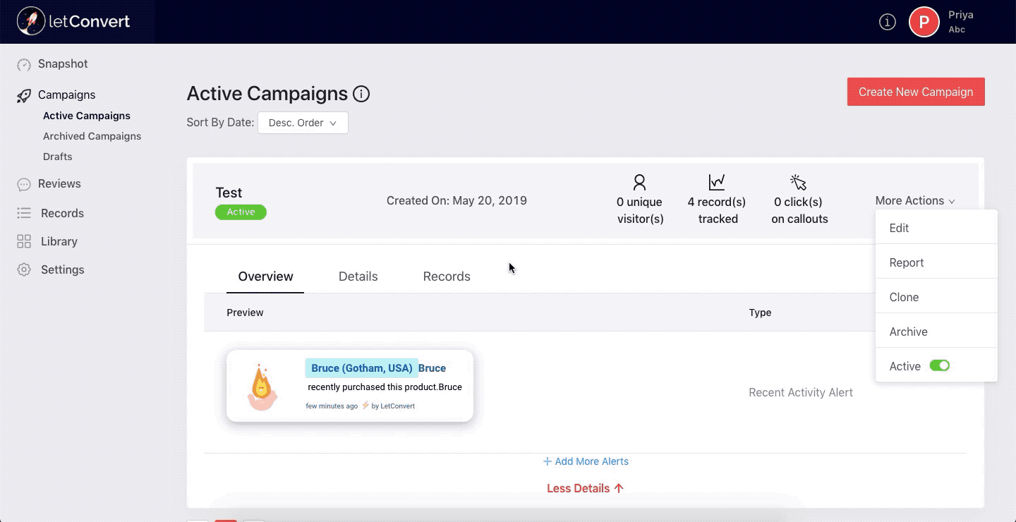 STEP 1: In your LetConvert dashboard, go to Campaigns >> Active Campaign. You’ll find all the campaigns which are active here.