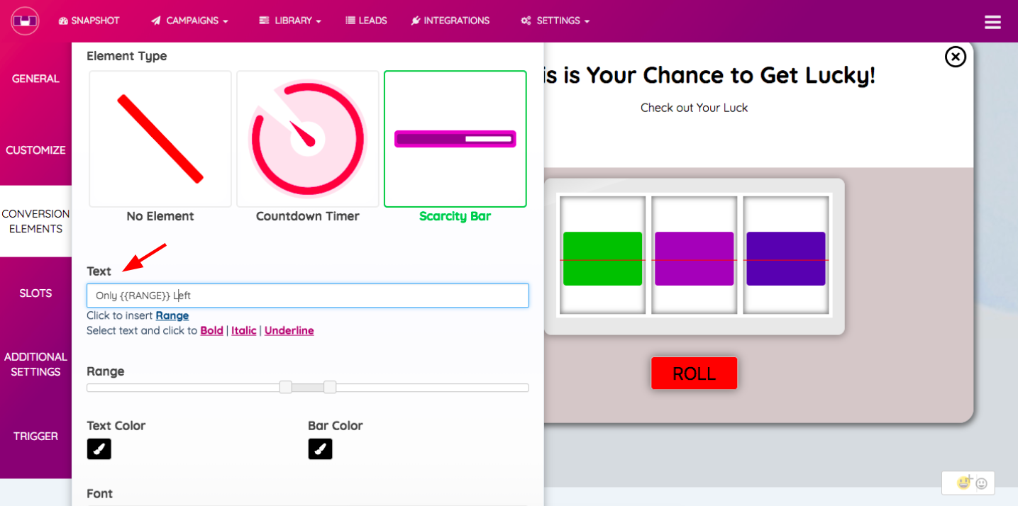 1. While creating or editing the campaign, go to Conversion Elements tab. 2. Click on Scarcity Bar from the options. Note: If you are unable to find what you were looking for here, please feel free to reach us anytime at support@letx.co.