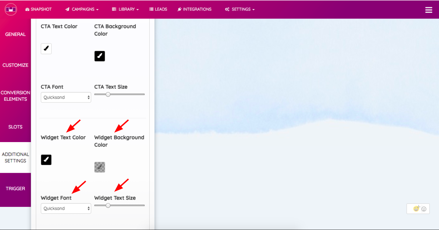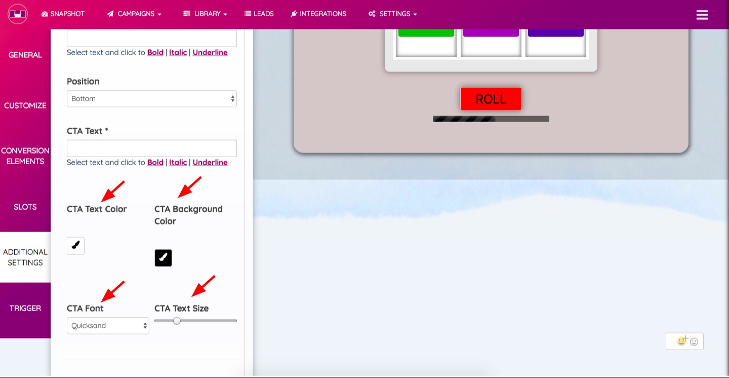4. In the section below, you have the option to modify CTA Text Color, ‘CTA Background Color, CTA Font and CTA Size.
