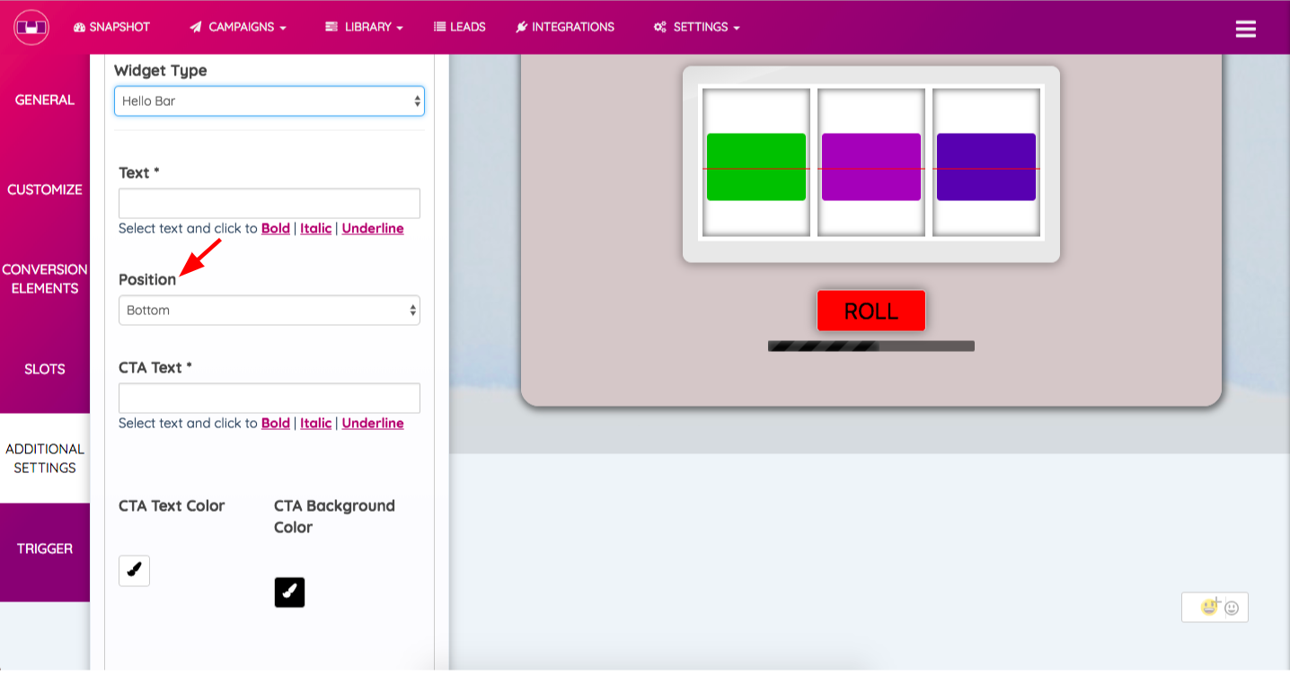 2. Position - In the Position section, you can specify the position of the Hello Bar. For instance “Top Left” or “Bottom Right”.