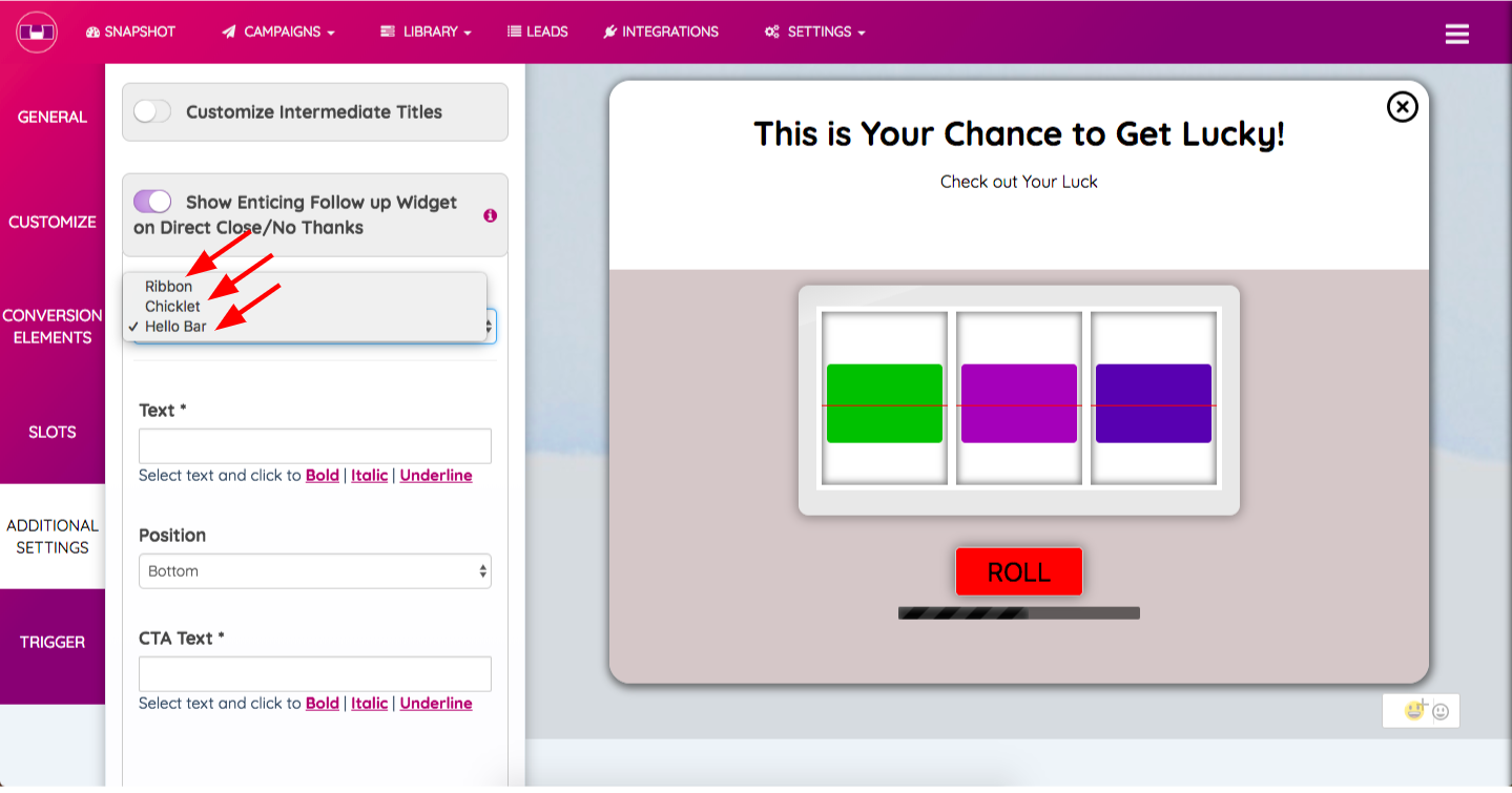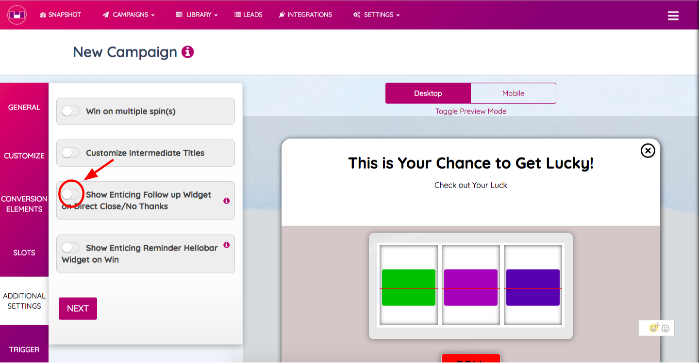 STEP 1: While creating or editing a campaign, go to the “Additional Settings” tab and slide the toggle by the name - “Show Enticing Follow Up Widget on Direct Close/No Thanks” on the right-hand side.
