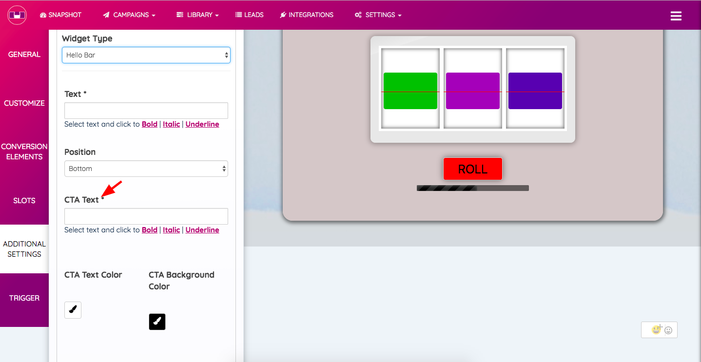 3. CTA Text - In this section, you can write whatever you wish to display as a Call To Action’. For instance “Claim Now”.