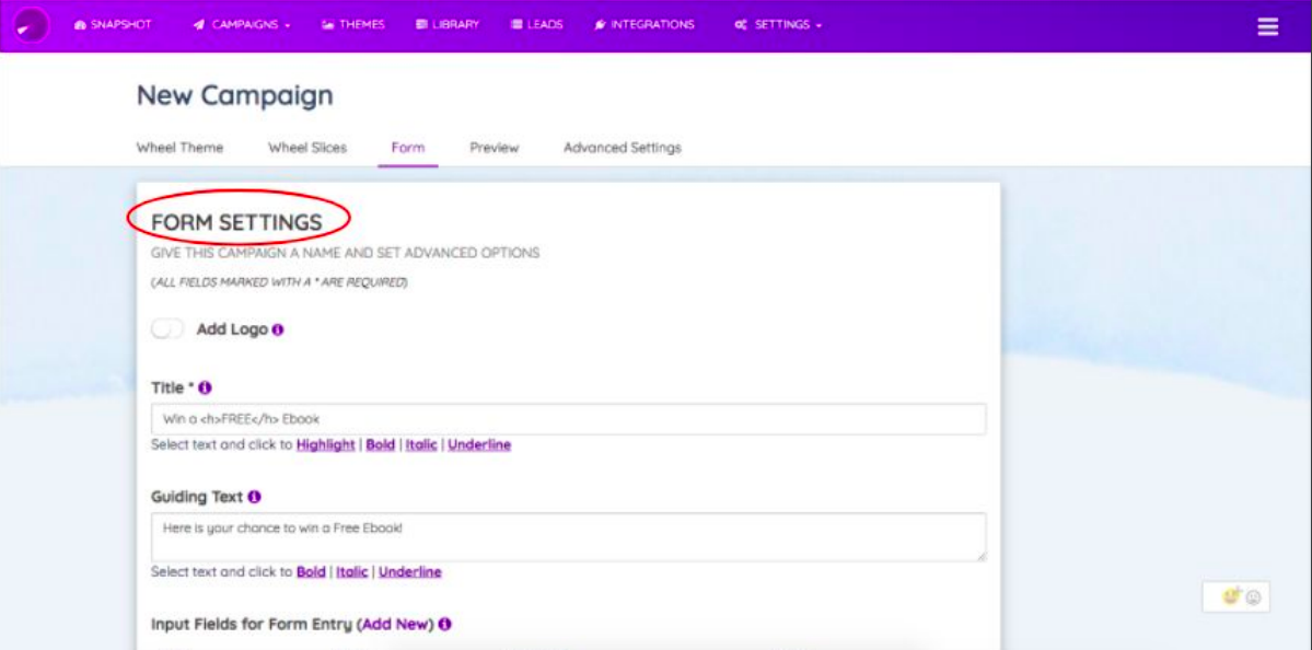 “Form Settings” will help you configure the form that will display on the right-hand side of the Fortune Wheel on the website.