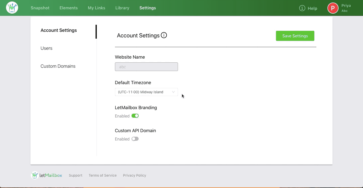 Under this section, you can find your Website name, Timezone, LetMailbox branding and Custom API Domain.